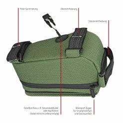 - Features: Trinkflaschenhalter, Schultergurt, Tragegriff, Spanngummis an der Oberseite, 3M Reflektor-Streifen, Rucklichtaufnahme, Regenhulle optional